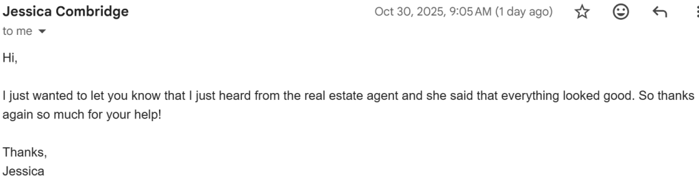 Bond Cleaning at Jessica’s on 30/10/25 – Here is her email letting us know the outcome of our services. Thanks, Jessica.